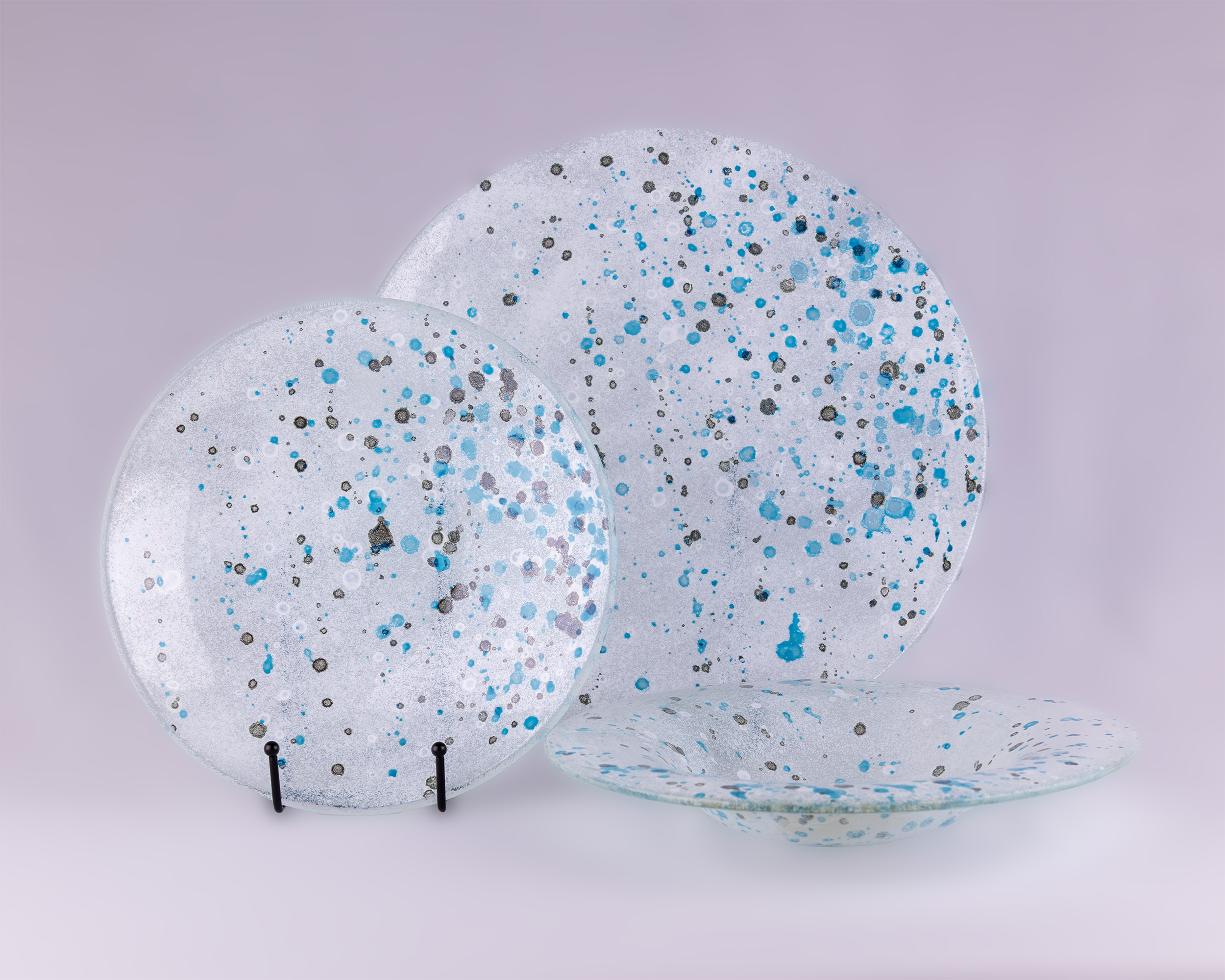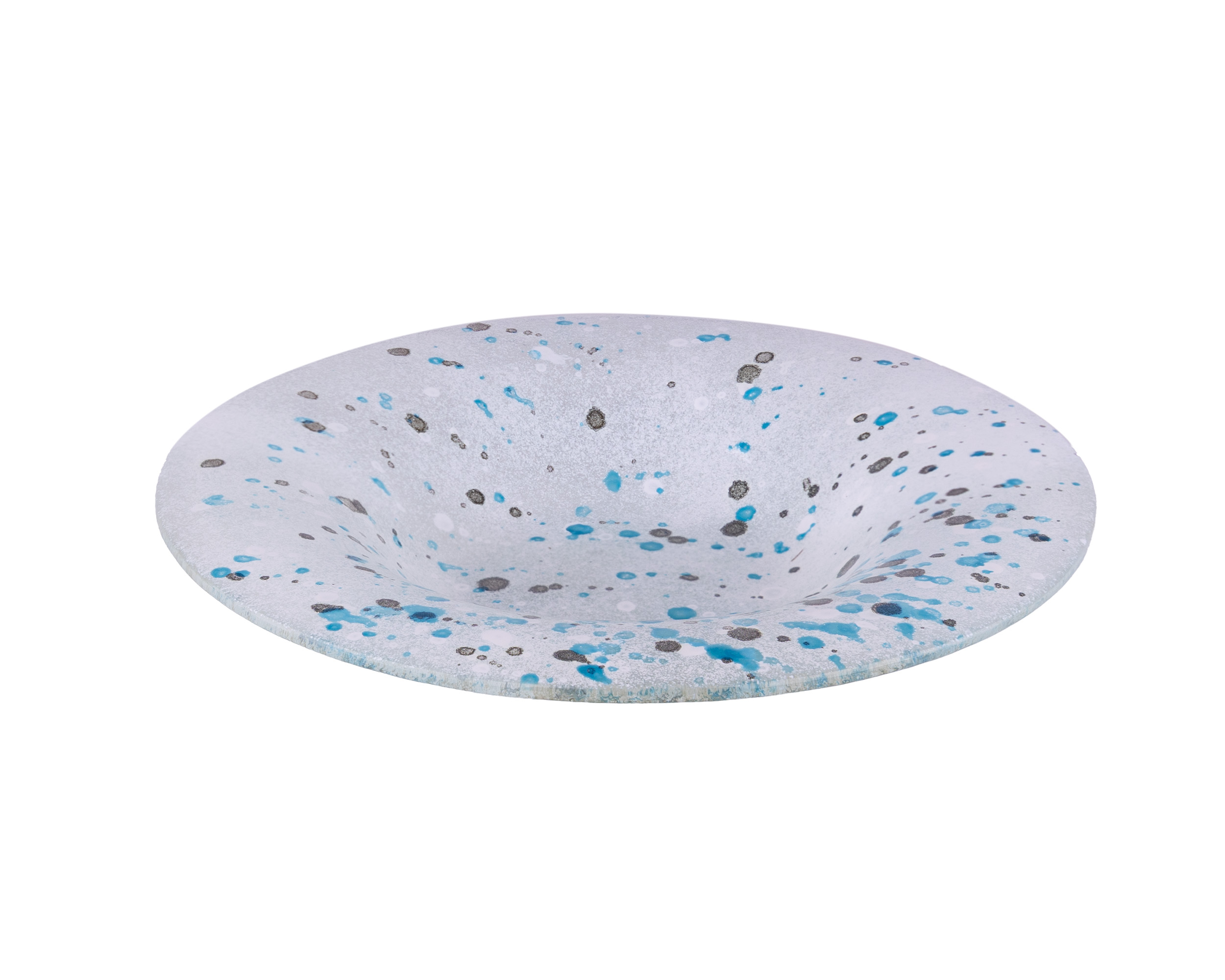 Kulatý skleněný talíř BOUNTR 2 BLU je výrazným designovým prvkem, který vyniká originální barevnou kombinací šedé, tyrkysové a bílé. Každý kus je ručně vyráběný tradiční technikou sypání skleněné drti, která se následně zatavuje při vysoké teplotě 800–850 °C. Díky tomu je barevný dekor trvalý a nesmyvatelný, což zaručuje dlouhou životnost a stálost barev. Talíř BOUNTR 2 BLU je ideální volbou pro milovníky ručně vyráběného skla a originálních designových kousků, kteří ocení spojení tradičního řemesla s moderním barevným pojetím.